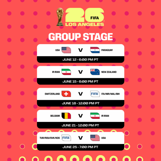 El Estadio Los Ángeles contará con ocho encuentros de la Copa Mundial de la FIFA, incluyendo el debut de Estados Unidos el viernes 12 de junio de 2026.