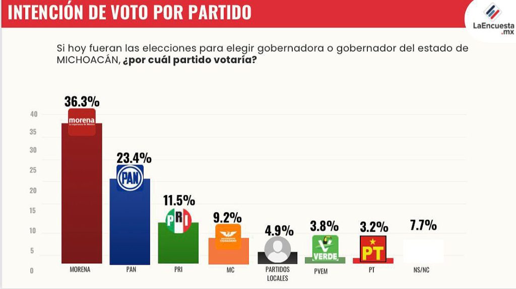 Ante la pregunta de intención de voto por partido, Morena alcanza 36.3%, superando de manera significativa al Partido Acción Nacional (23.4%) y al Partido Revolucionario Institucional (11.5%), mientras que otras fuerzas políticas se mantienen en niveles considerablemente menores.
