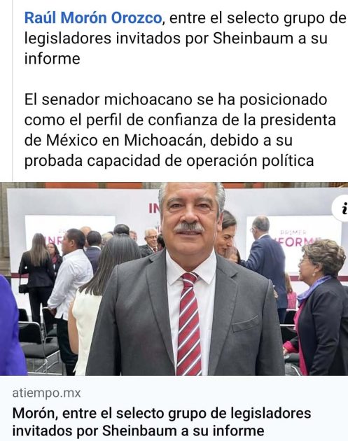 El profesor en Educación Física, Raúl Morón Orozco, se autonombra como “el hombre de confianza de Claudia Sheinbaum. Y contrario a los supuestos principios y estatutos de Morelia también se dice que es de un selecto grupo. ¿Sabrá la Presidenta de México que usan así su nombre en un proselitismo descarado del actual senador de la República? Nadie respeta las recomendaciones de la Ejecutiva federal, la ambición por la candidatura por la gubernatura de Michoacán es desmedida.