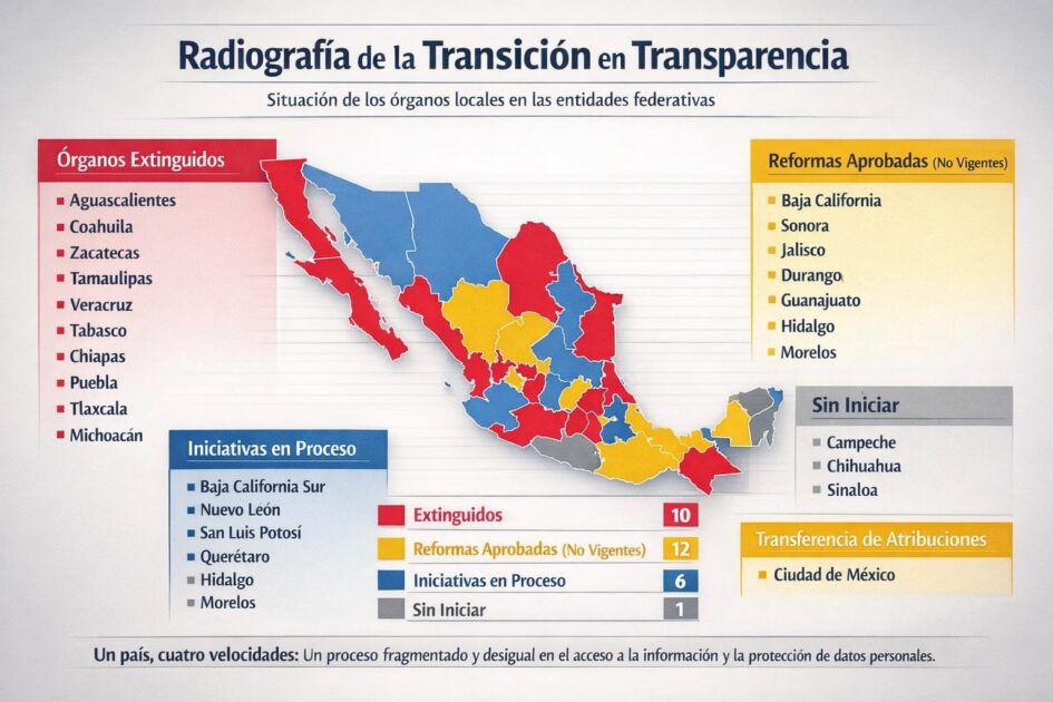 Tras la desaparición del órgano nacional de transparencia, las entidades federativas han avanzado de manera desigual en la redefinición de sus sistemas locales. Al cierre del primer semestre de 2025, una decena de estados había extinguido formalmente sus órganos locales de transparencia, entre ellos Aguascalientes, Coahuila, Zacatecas, Tamaulipas, Veracruz, Tabasco, Chiapas, Puebla, Tlaxcala y Michoacán, aunque solo algunos reportan operación efectiva del nuevo esquema.