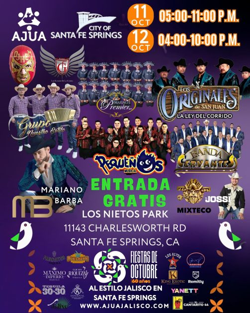 Este gran evento se realizará este sábado 11 y domingo 12 de octubre en Los Nietos Park de la ciudad de Santa Fe Springs y se estará festejando al estilo Jalisco, habrá una variedad de artistas de talla internacional tales como La Banda Pequeños Musical, Los Originales de San Juan, Mariano Barba, Grupo Nuestro Estilo, Mariachi Premier, Jossi y su banda, DJ Hem, Fuerza G, Ballet Folklorico Mixtexo, Banda Cervantes y Grupo Nuestro Estilo entre muchos otros artistas y sorpresas mas.