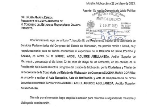 Morelia, Michoacán.- El ex auditor Miguel Ángel Aguirre Abellaneda no fue notificado por el Congreso del Estado para que acudiera al Pleno a defenderse sobre el juicio político que interpuso la contralora estatal, Azucena Marín Correa.